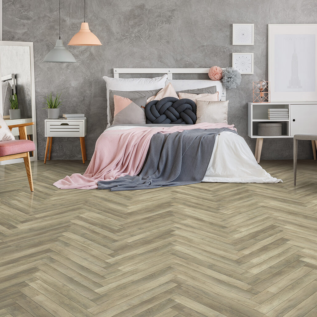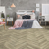 Kraus Odell Oak is a waterproof herringbone pattern LVT with integral underlay and Rigid Core Technology. A rustic brown colour with varying shades creates a high contrast look across the room. Ideal for use in most living spaces. It cuts easily with a knife and provides an easy and clean flooring solution which is also resistant to scuffs and stains.