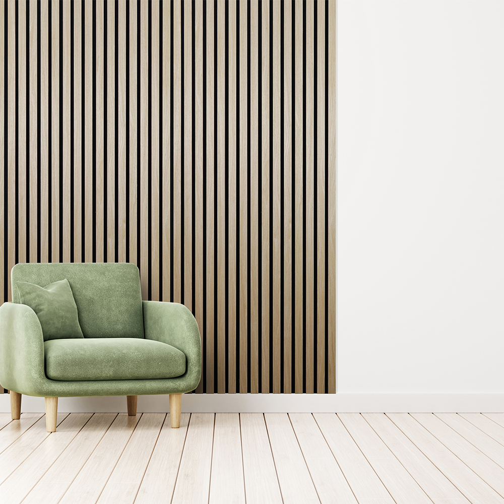 Enhance the aesthetics of dull interior walls with Kraus Acoustic Wall Panels. Featuring decorative MDF slats with an acoustic felt back technology, these panels instantly create 3D wall texture to halls, lounges, bedrooms and commercial environments. They can be applied horizontally or vertically as required. The Natural Oak panel design is a pale veneer finish combined with a subtle clear grain pattern. It’s a classic colour palette that complements the majority of decors.